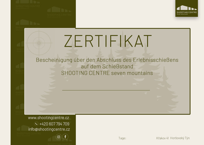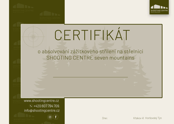Po absolvování střelby od nás získáte CERTIFIKÁT O STŘELBĚ , případně si můžete u nás na památku zakoupit i reklamní předměty s logem naší firmy SHOOTING CENTRE seven mountains. Nově nabízíme i možnost, spojit svůj zážitek s fotografováním a tak získáte zas něco navíc a nezapomenutelnou vzpomínku.