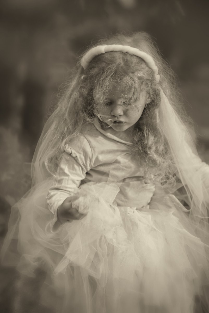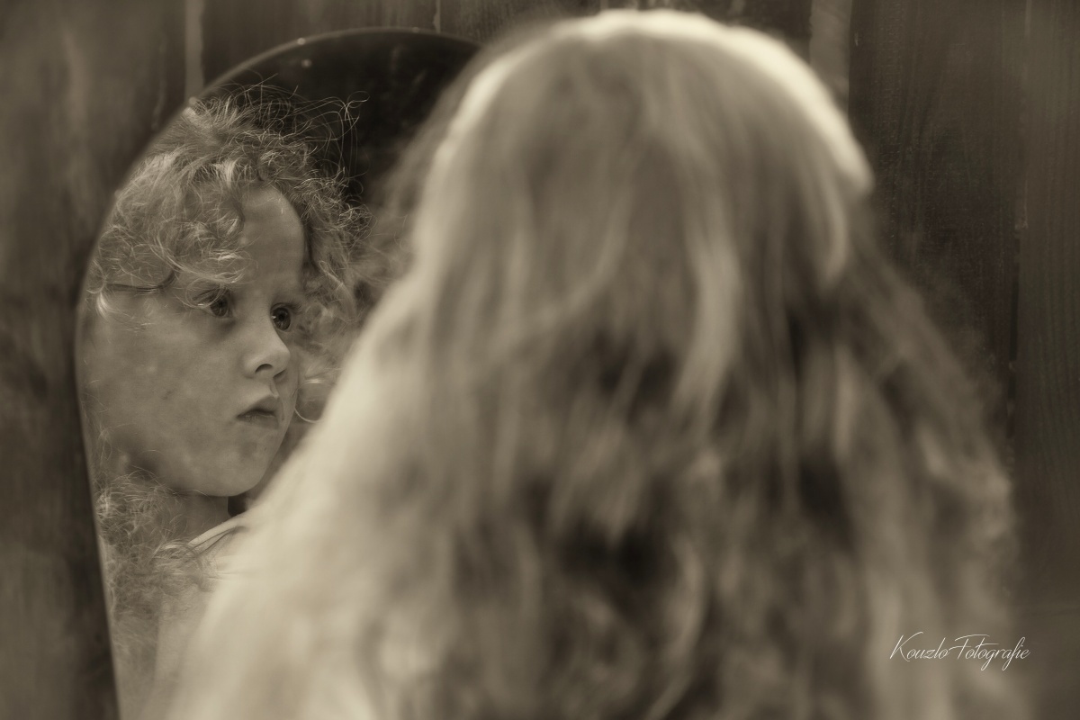 A ani bouřka, která se během focení strhla nám nepřekazila atmosféru… sotva přestalo pršet, už si to maličká Viky ťapkala v mokré trávě a aniž by mi věnovala jakoukoli pozornost, hrála si před zrcadlem a vytvářela si své sny o princezně, o obrazu za zrcadlem. Prstíkem si do zaprášeného zrcadla malovala kytičky a jen občas po mě hodila šibalské očko, abych si byla jistá, že o mně ví…